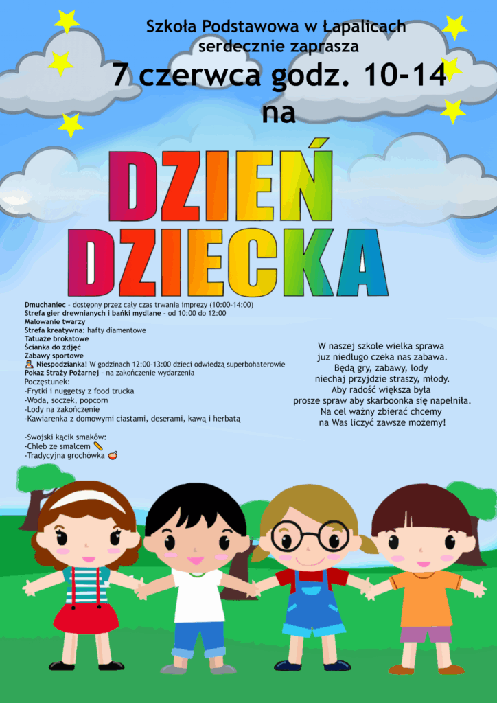 Już 7 czerwca w godz. 10:00–14:00 na terenie Szkoły Podstawowej w Łapalicach odbędzie się wyjątkowy Festyn Rodzinny z okazji Dnia Dziecka! Czekają na Was dmuchańce, gry i zabawy, tatuaże brokatowe, malowanie twarzy, strefa kreatywna i mnóstwo pyszności. Nie zabraknie też niespodzianek i wizyty superbohaterów! Będzie radośnie, kolorowo i rodzinnie – widzimy się już wkrótce!