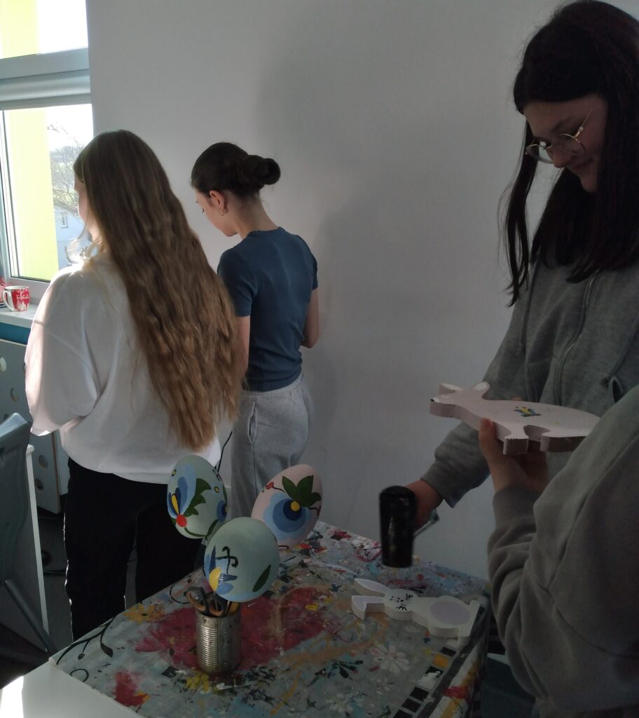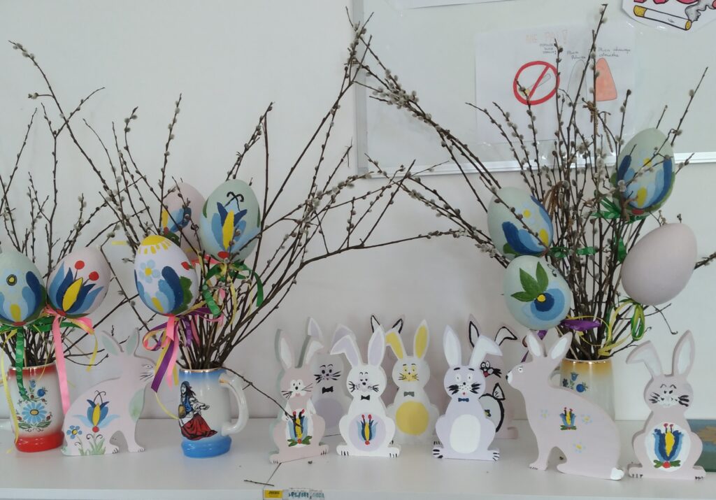 Uczniowie samodzielnie malowali pisanki, zdobiąc je motywami kwiatów charakterystycznych dla haftu kaszubskiego. Powstały prawdziwe dzieła sztuki – kolorowe, starannie wykonane i pełne uroku. Inni uczniowie postawili na drewniane zajączki, które ozdabiali wzorami inspirowanymi kaszubskim folklorem, kolorowymi elementami i barwnymi wstążkami.