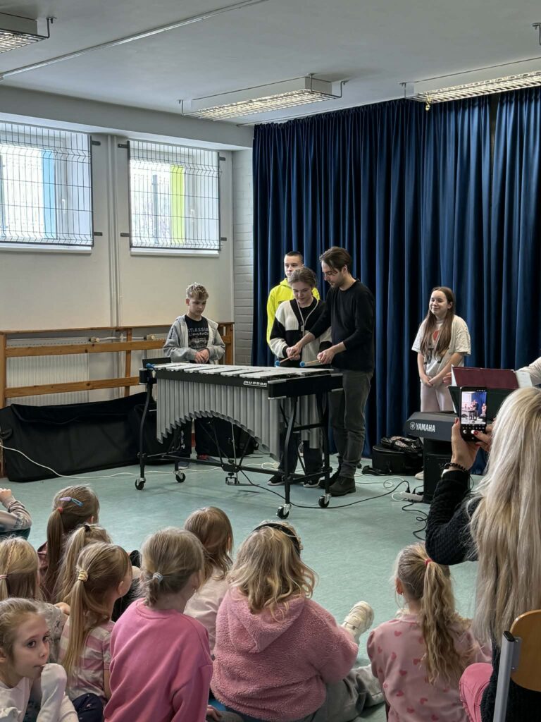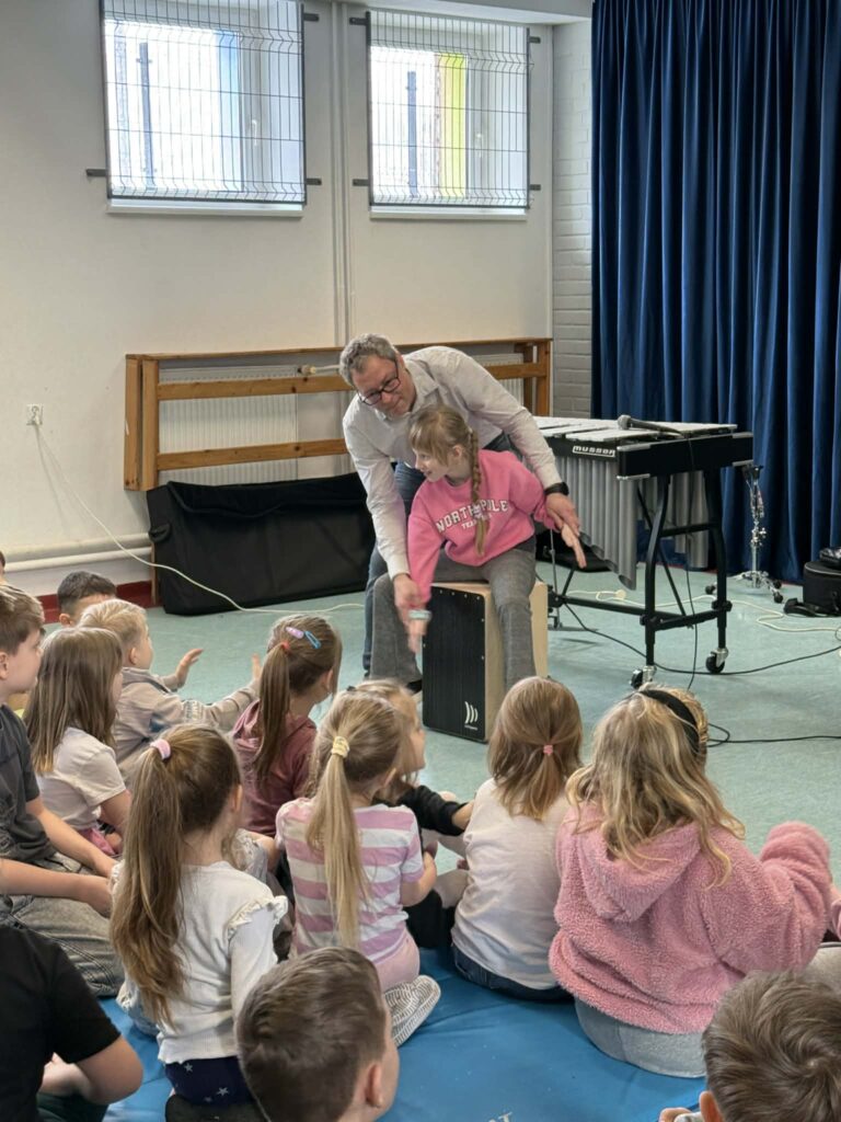 Pan Paweł w ciekawy i przystępny sposób opowiadał o tym, jak powstaje muzyka, czym jest rytm i jak ważne są wibracje w tworzeniu dźwięku. Największą atrakcją była możliwość aktywnego udziału – chętni uczniowie mogli spróbować swoich sił w grze na instrumentach i poczuć się jak prawdziwi muzycy. To była niezwykle inspirująca i radosna lekcja, która pokazała, że muzyka może być nie tylko nauką, ale także świetną zabawą.