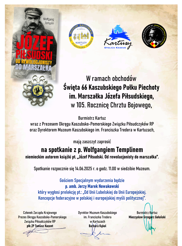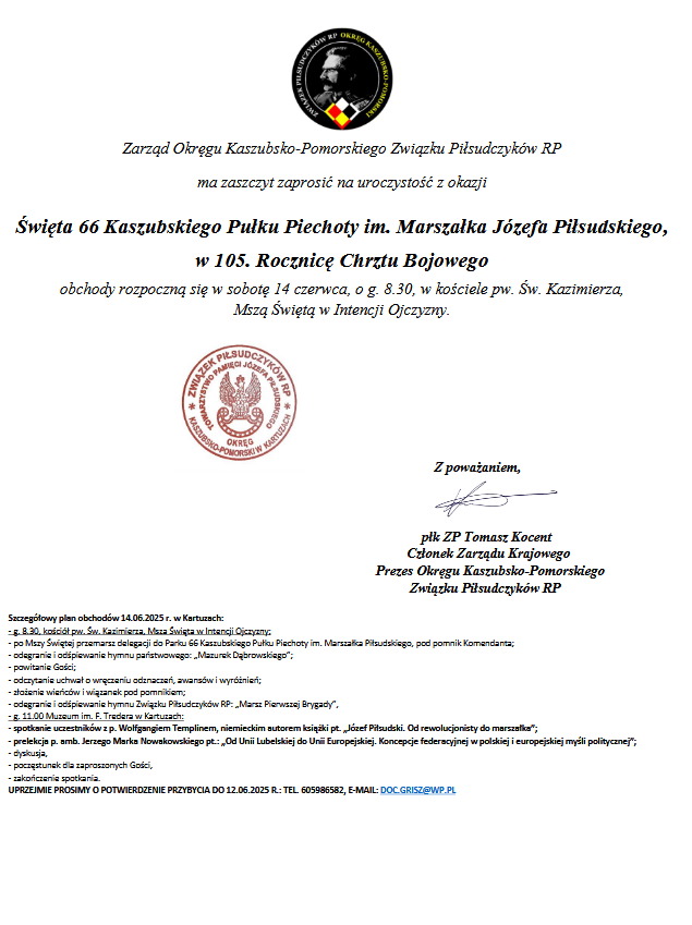 Zaproszenie na Święto 66 Kaszubskiego Pułku Piechoty im. Marszałka Józefa Piłsudskiego